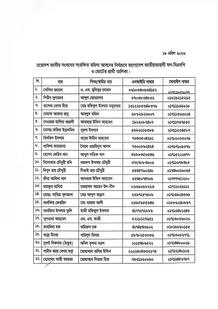 প্রান্তডেস্ক:ত্রয়োদশ জাতীয় সংসদে সংরক্ষিত নারী আসনে মনোনয়নপ্রাপ্ত প্রার্থীদের তালিকা চূড়ান্ত করেছে বিএনপি।
